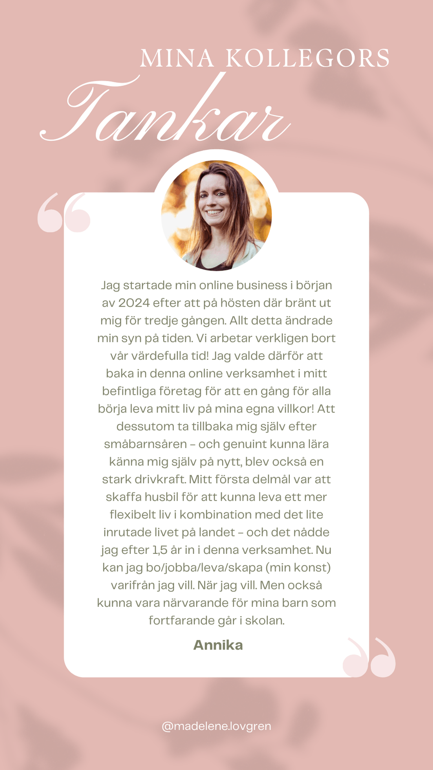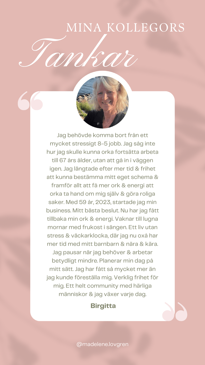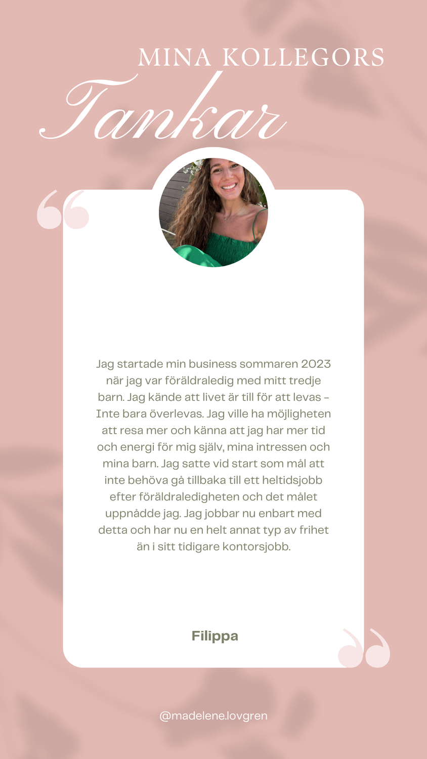 Vad roligt att du är här! 💕 Jag längtade, precis som du, efter en förändring. Jag startade min business under 2023 då jag längtade efter mer tid för barnen, mig själv, trädgården och övriga intressen samt att få styra mina egna dagar. Jag är så glad att jag vågade satsa då det idag är min huvudsyssla. Nu får jag hjälpa andra att uppleva sina drömmar till ett friare liv!