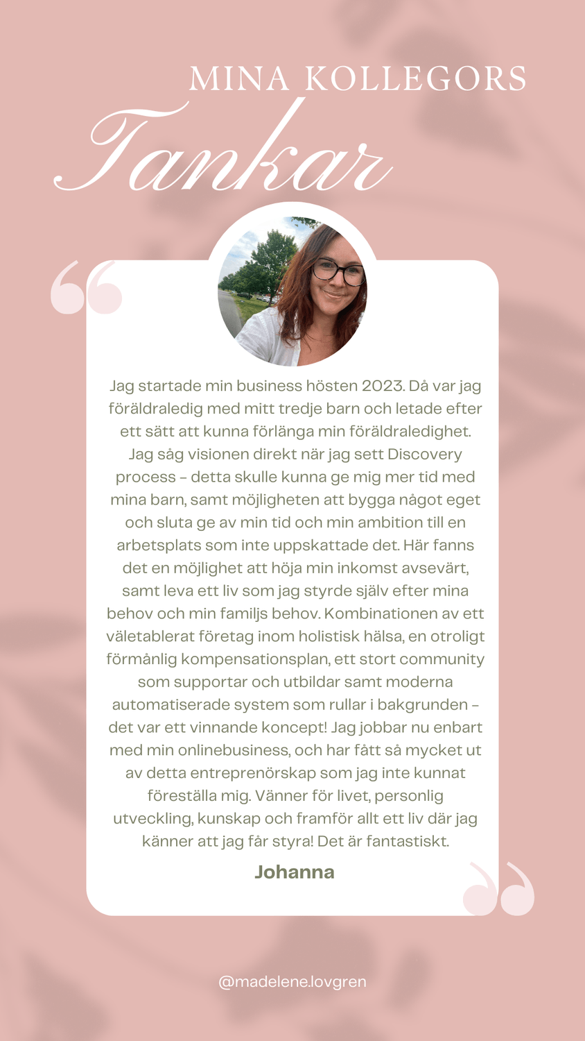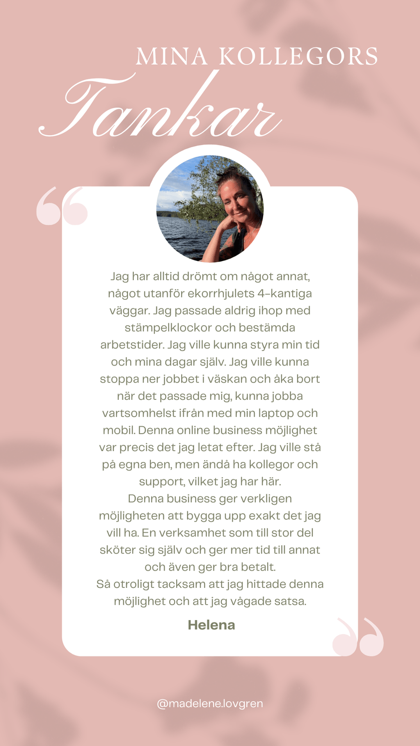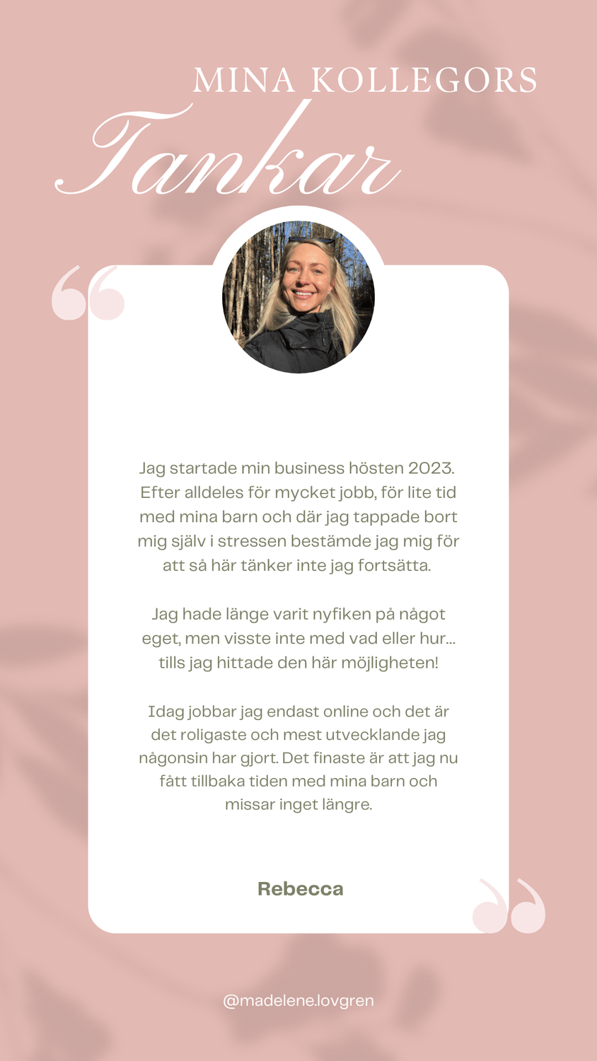Vad roligt att du är här! 💕 Jag längtade, precis som du, efter en förändring. Jag startade min business under 2023 då jag längtade efter mer tid för barnen, mig själv, trädgården och övriga intressen samt att få styra mina egna dagar. Jag är så glad att jag vågade satsa då det idag är min huvudsyssla. Nu får jag hjälpa andra att uppleva sina drömmar till ett friare liv!